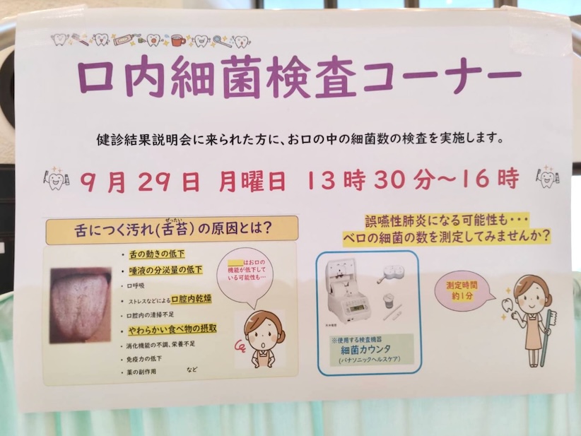 内容は口腔機能維持に関する基礎知識などで、舌圧測定やガムによる咀嚼力チェックも行っています。